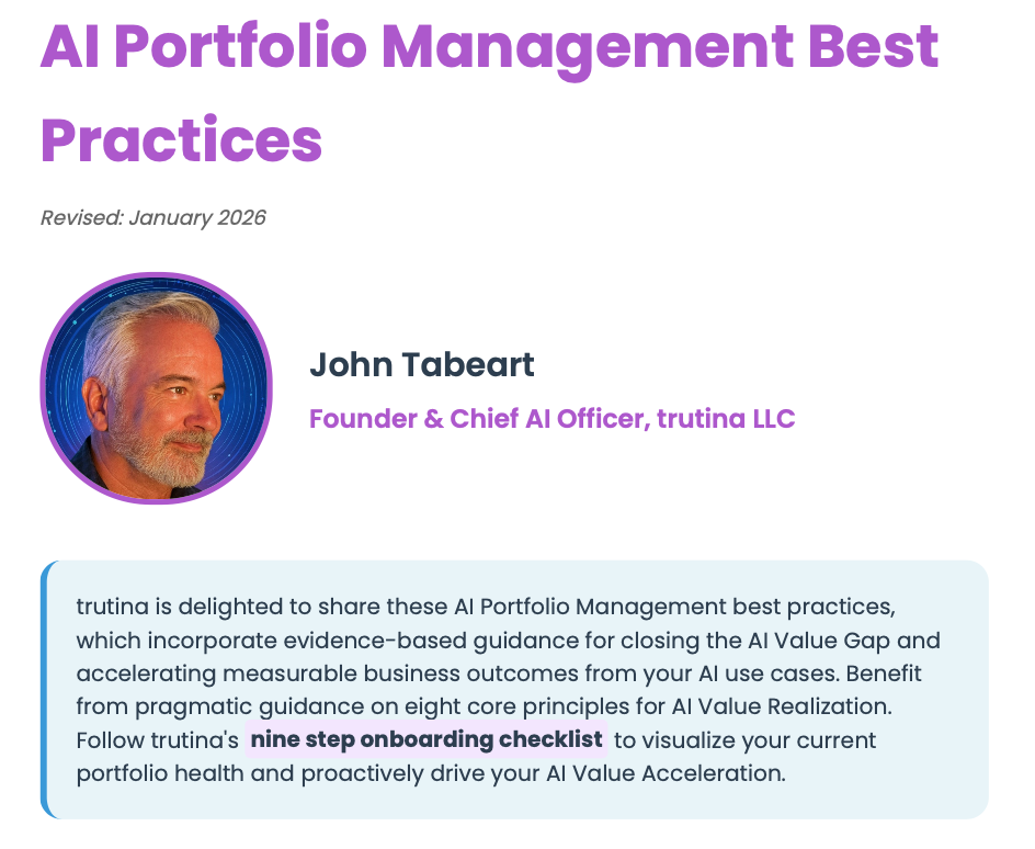 "Having spent much of my career in financial services and technology, what impressed me most about AIVA - trutina's AI Value Accelerator - is how grounded it is. It doesn't just spin out AI ideas; it ties them back to strategy, enterprise architecture, and what competitors are actually doing.